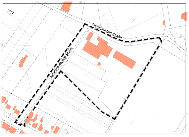 Abbildung: Auszug aus der Liegenschaftskarte mit Eintragung der Grenze für den vorläufigen räumlichen Geltungsbereich des Bebauungsplans (strichlierte Umgrenzungslinie), ohne Maßstab