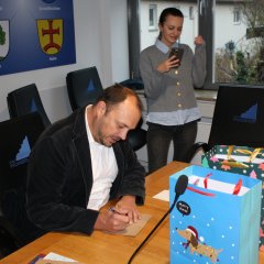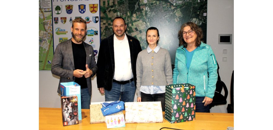 Auch Bürgermeister Patrick Koch und der designierte Bürgermeister Maximilian Schimmel haben ihre Geschenke für je zwei Kinder liebevoll für den Transport in die Ukraine zusammengestellt und verpackt.