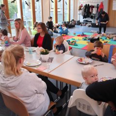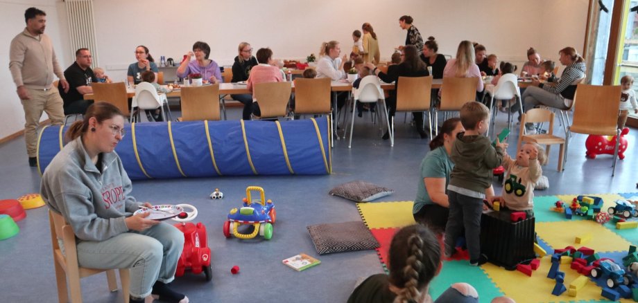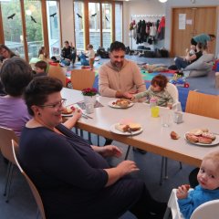 Fast 40 große und kleine Menschen beim gemeinsamen Frühstück im Babytreff