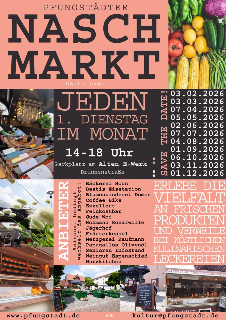 Genießen, entdecken, regional einkaufen – auch 2026 lädt der Pfungstädter Naschmarkt wieder jeden ersten Dienstag im Monat zum Bummeln und Probieren ein. Freuen Sie sich auf eine vielfältige Auswahl an regionalen und handverlesenen Spezialitäten, kulinarischen Köstlichkeiten und besonderen Produkten.