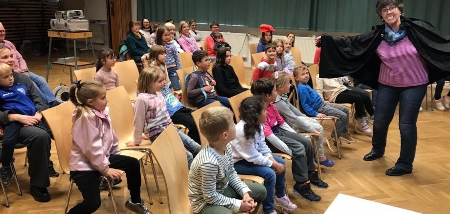 Zur großen Überraschung für die großen und kleinen Besucher verkleidete sich Karoline Lindner-Dittmann am Ende der Veranstaltung als Vampir-Fledermaus, um aber auch gleich darauf hinzuweisen, dass es selbstverständlich keine blutsaugenden Menschen in Wirklichkeit gibt.