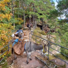 Am Mittwoch (15.10.) stand eine Eseltour auf dem Programm. Die Mädchen* und Jungen* lernten, wie man die Esel mit Satteltaschen belädt und wie man sie richtig führt. Die Eseltour führte durch verschlungene, wilde Pfade und karge Felsen in luftiger Höhe. Am Ende der Tour erkundeten die Kinder die Dahner Altburg.