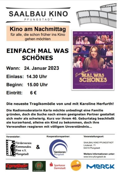 Karla (Karoline Herfurth) hat die Suche nach ihrem Traummann satt. Ein missglücktes Date jagt das Nächste, doch ihre biologische Uhr tickt und so entscheidet sich Karla vor ihrem 40. Geburtstag dazu, die Sache alleine in die Hand zu nehmen. Durch künstliche Befruchtung will die Radiomoderatorin ganz unabhängig von einem Partner schwanger werden. Doch Karla hat die Rechnung ohne ihre exzentrische Familie gemacht. Sowohl ihre Schwestern Jule (Nora Tschirner) und Johanna (Milena Tscharntke), als auch ihre Eltern (Ulrike Kriener und Herbert Knauf) haben starke Meinungen bezüglich Karlas ungewöhnlicher Familienplanung. Karlas ohnehin schon komplizierte Beziehung zu ihrer Familie wird somit auf die Probe gestellt. Am meisten stellt aber eine unvorhergesehene Wirbelwindromanze mit dem deutlich jüngeren Ole (Aaron Altaras) Karlas Leben auf den Kopf. Einlass ist um 14.30 Uhr, Filmbeginn 15 Uhr. Für diese Veranstaltungsreihe wurde ein vergünstigter Eintrittspreis von 6 € vereinbart. Alle Termine, Einlass- und Anfangszeiten im Saalbau-Kino, Infos und Trailer sind unter www.kino-pfungstadt.de zu finden. Übrigens: Hier ist es jetzt auch möglich, Kinokarten direkt über die Homepage beim jeweiligen Film zu reservieren.