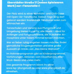 Der Platz wird zu einer Wohlfühl- und Chill-Oase mit Open-Air-Tanzfläche. Sieben Tage lang darf getanzt werden! Kostenfreie Tanzkurse laden zum Mitmachen ein.