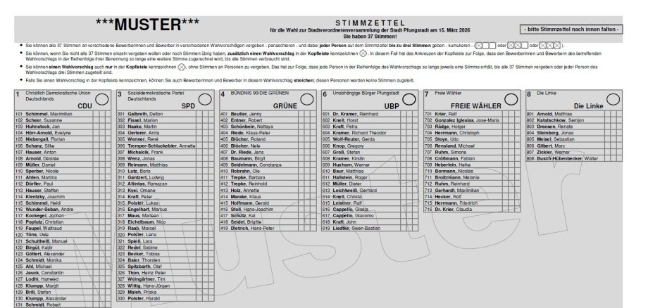 Die Musterstimmzettel dienen der Orientierung und zeigen den grundsätzlichen Aufbau der jeweiligen Stimmzettel. Sie ermöglichen es, sich bereits im Vorfeld mit dem Wahlverfahren und den zur Wahl stehenden Listen und Kandidatinnen und Kandidaten vertraut zu machen.