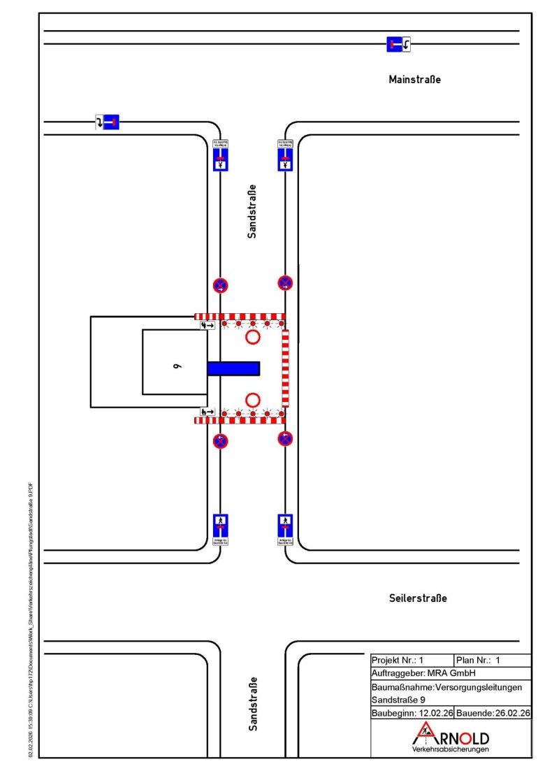 Von Donnerstag,12.02.2026 bis Donnerstag, 26.02.2026 wird in Höhe Sandstraße 9 wegen Arbeiten an den Versorgungsleitungen gesperrt.