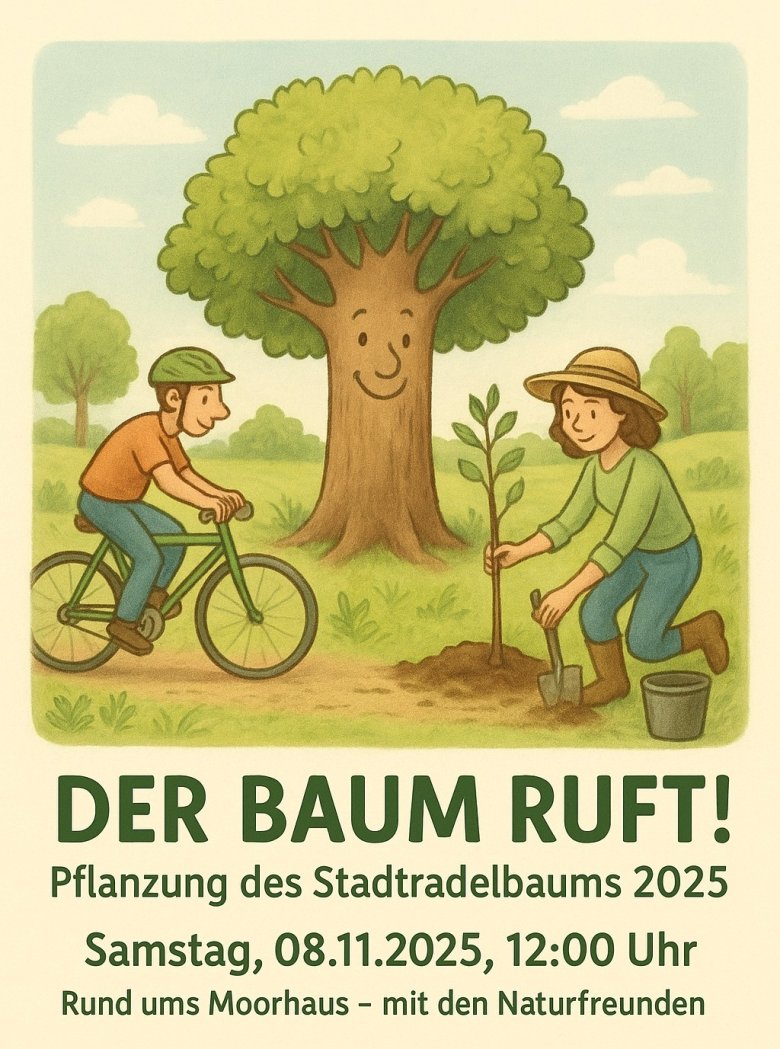 Die Pflanzung des Stadtradelbaums findet am 08.11.2025 um ca. 12:00 Uhr - eingerahmt von der großen Pflanzaktion der Naturfreunde rund um das Moorhaus - statt.