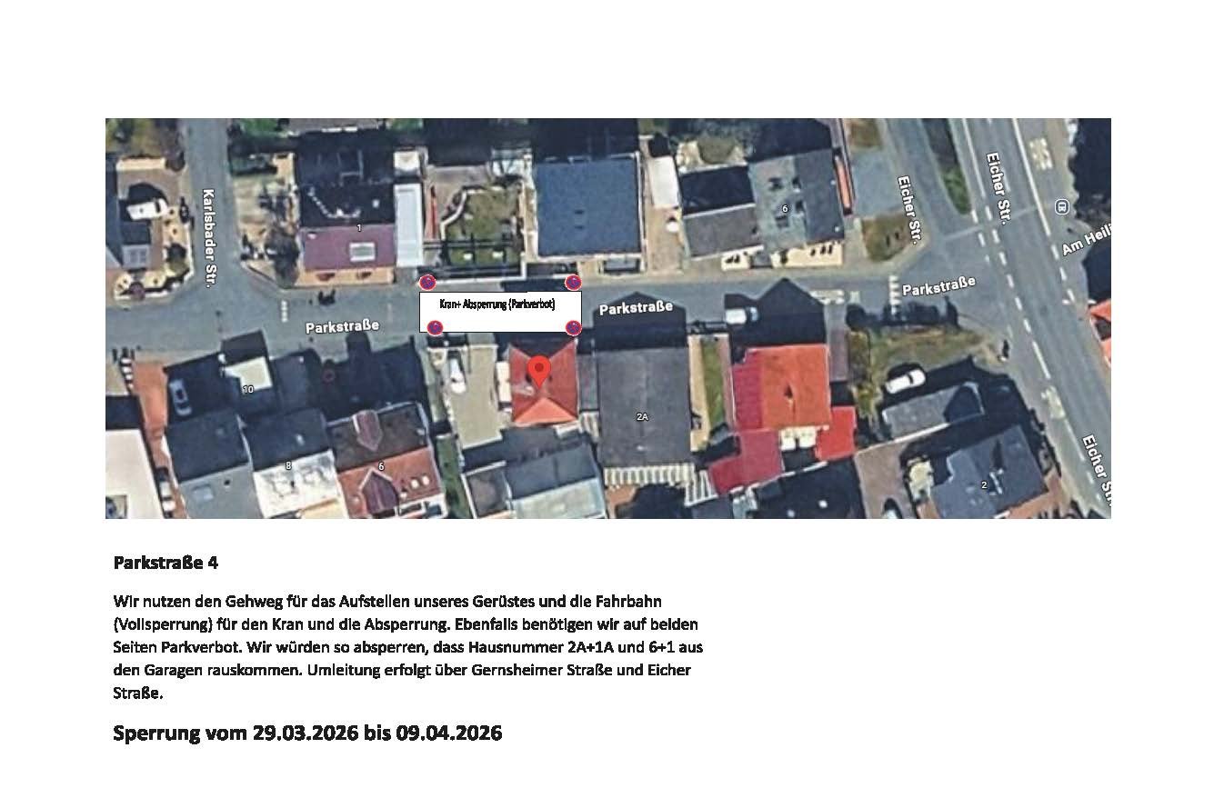 Im Zuge einer Dachsanierung wird die Parkstraße 4 in Pfungstadt-Hahn über den ursprünglich angekündigten Zeitraum hinaus weiterhin für den Verkehr voll gesperrt. Die Vollsperrung verlängert sich nun bis voraussichtlich Freitag, 17.04.2026.