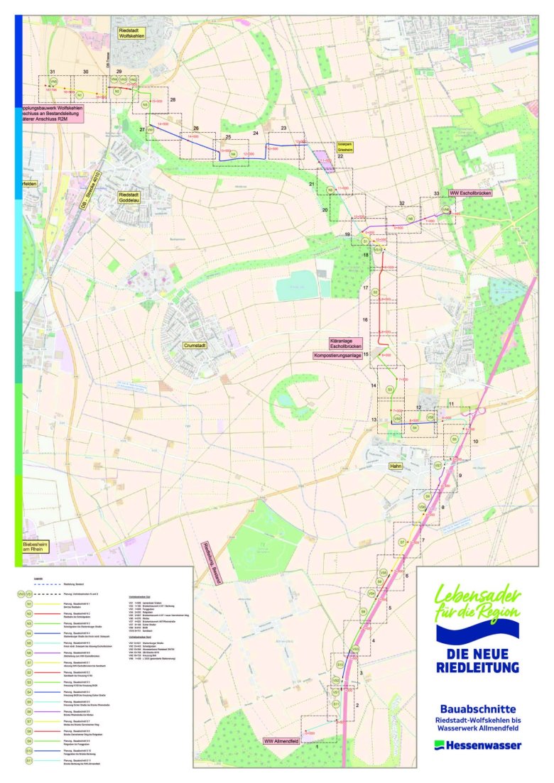Innerhalb der Gemarkung Pfungstadt verläuft die neue Transportleitung auf einer Länge von rund 7,6 Kilometern. Die Bauarbeiten werden in mehreren Abschnitten umgesetzt, die sich teilweise bereits in der Ausführung befinden oder im weiteren Verlauf des Jahres beginnen sollen.