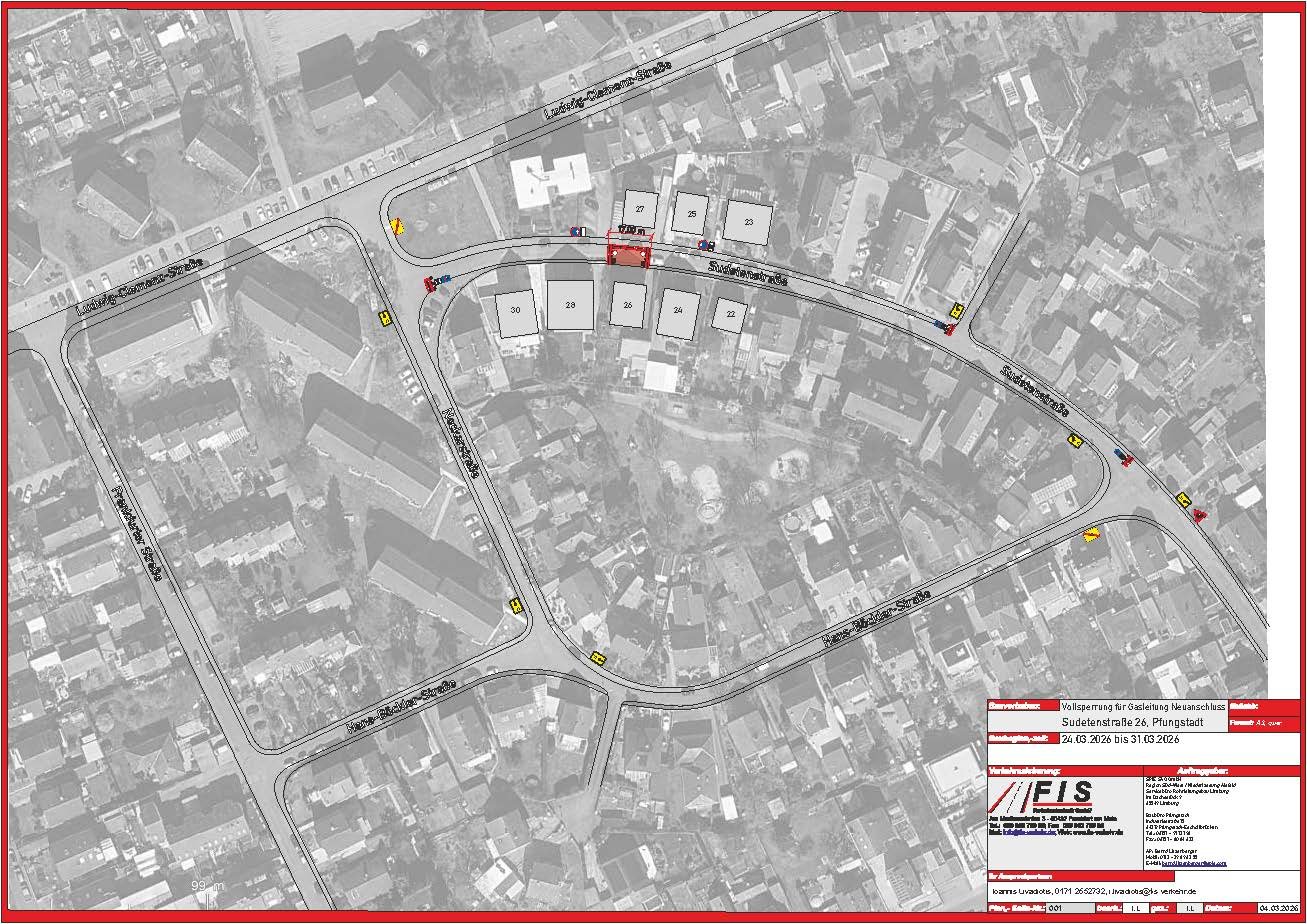Von Dienstag, 24.03.2026 bis Dienstag, 31.03.2026 wird in Höhe Sudetenstraße 26 wegen Neubau eines Gashausanschlusses im Auftrag der SPIE SAG GmbH voll gesperrt.