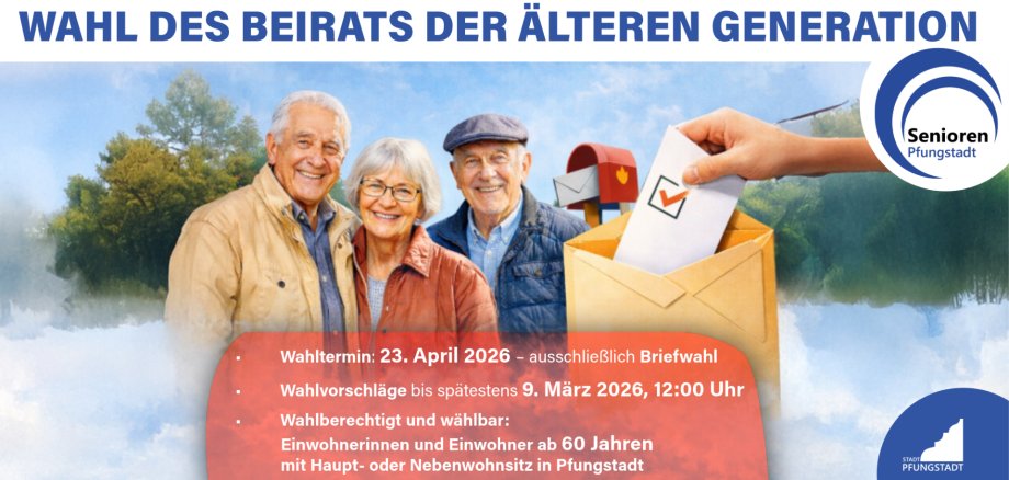 Am 23. April 2026 findet in Pfungstadt die Wahl des Beirats der älteren Generation statt. Wahlberechtigt sind alle Einwohnerinnen und Einwohner ab 60 Jahren. Die Wahl erfolgt ausschließlich per Briefwahl. Wahlvorschläge können bis zum 09. März 2026 eingereicht werden.