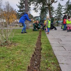 Im Anschluss der Bepflanzung wurde durch den Friedhofsbagger Erde verfüllt. Auch hier waren die Kinder hautnah dabei - aber mit dem nötigen Sicherheitsabstand. Die Aktion fand noch vor dem ersten Frost statt, damit die Zwiebeln bis zum Frühjahr gut anwachsen und perspektivisch die Grünfläche weiter aufwerten.