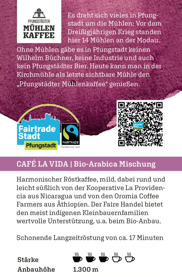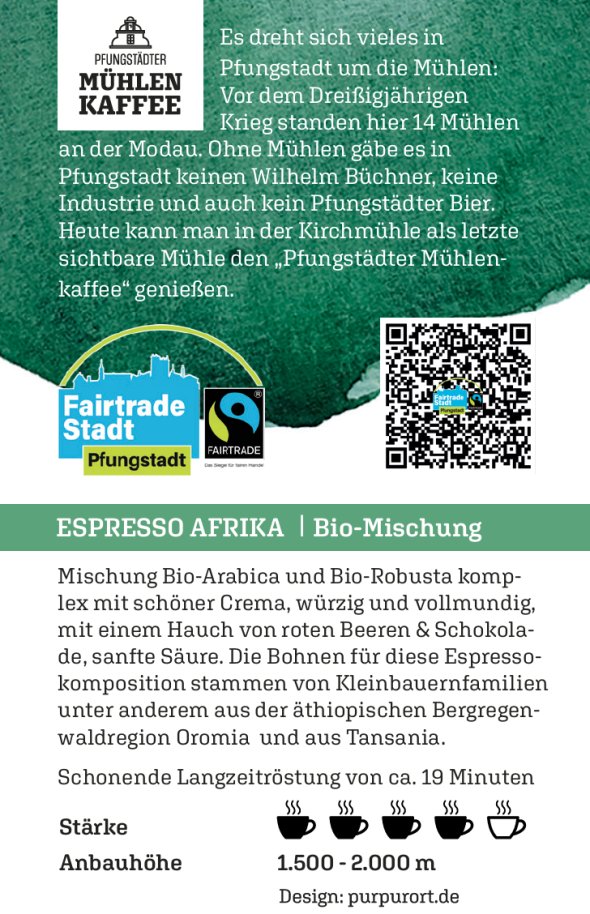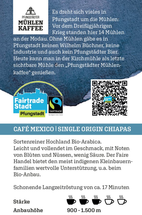 HINWEIS: Am Marktstand des FAIRein e. V. können Sie an jedem ersten Samstag im Monat (soweit es das Wetter zulässt) den Pfungstädter Mühlenkaffe verkosten und gerne auch direkt kaufen. Den Mühlenkaffee können Sie auch in der Kirchmühle zu den offiziellen Öffnungszeiten erwerben. Wir wünschen Ihnen gemütliche Kaffeestunden. Die Termine finden Sie auch in unserem Veranstaltungskalender.